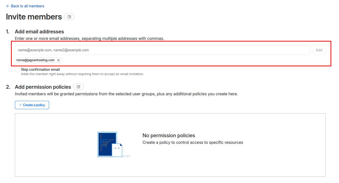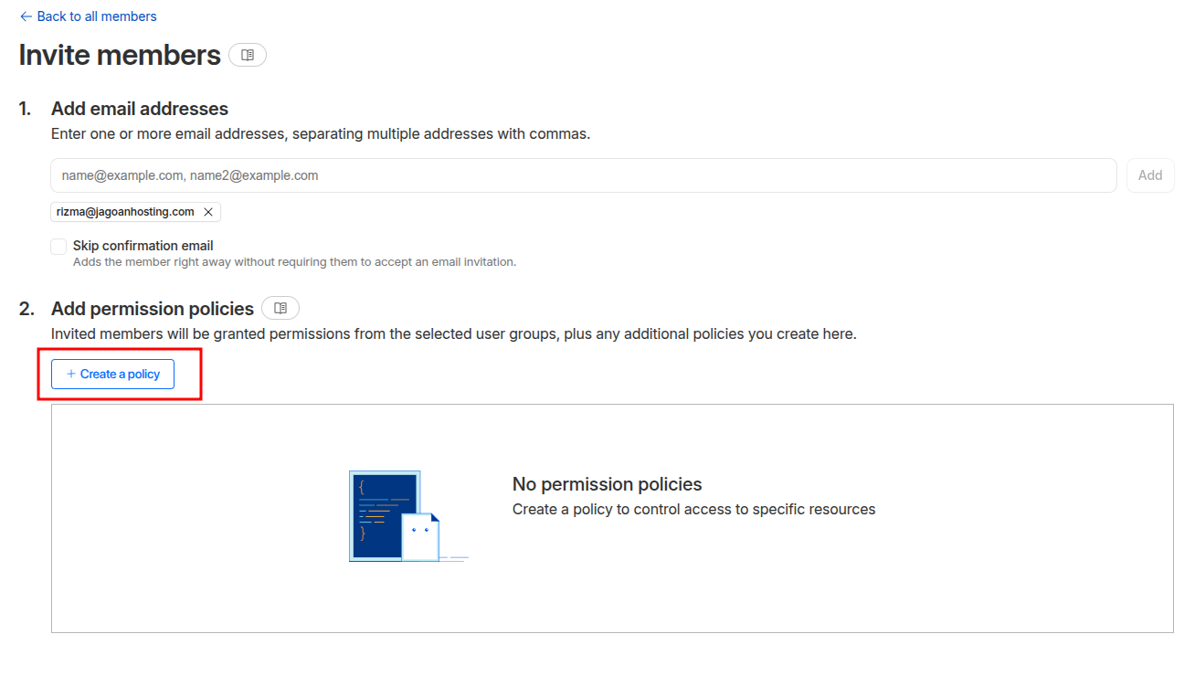 - Add Permission Policies: Tentukan izin atau hak akses atas member yang diundang. Klik create policy