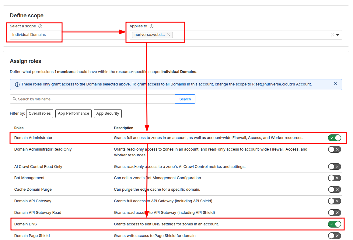 Pada bagian select a scope pilih individual domain dan pada bagian apllies to pilih domain yang nantinya boleh di akses oleh members. Kemudian untuk Roles pilih seperti yang ada di gambar berikut. Jika sudah klik button create policy