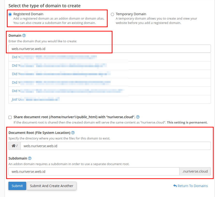 4. Silahkan ketikkan nama subdomain yang akan Kamu buat di menu Domain seperti gambar berikut.