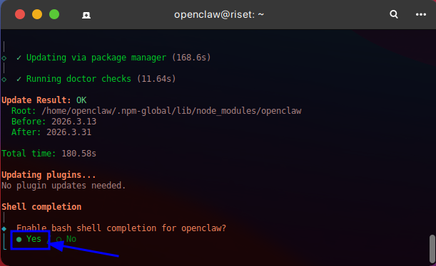 6. Tunggu proses update sudah selesai, dan jika sudah selesai cek kembali versi openclaw dengan perintah: