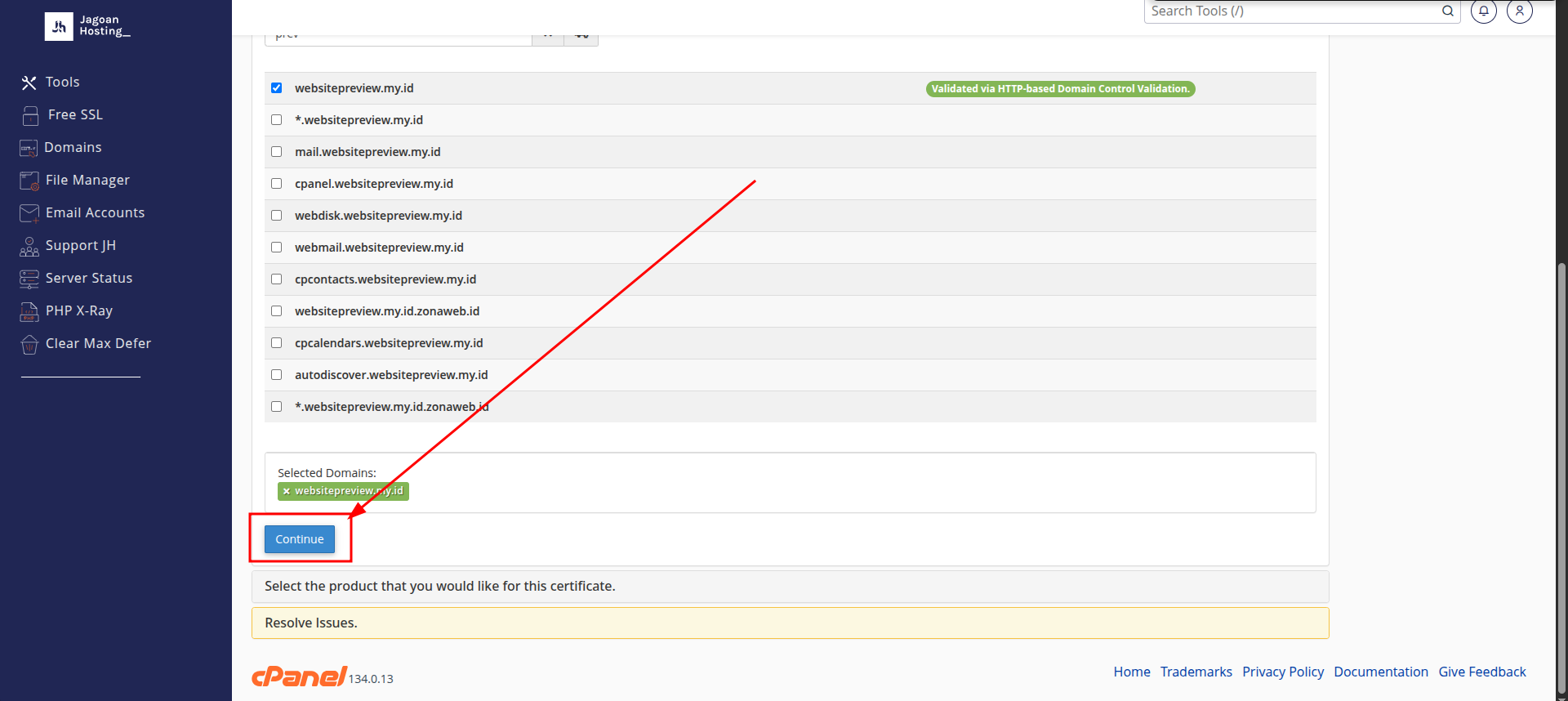 Kemudian jika sudah memilih nama domain. klik continue seperti gambar berikut