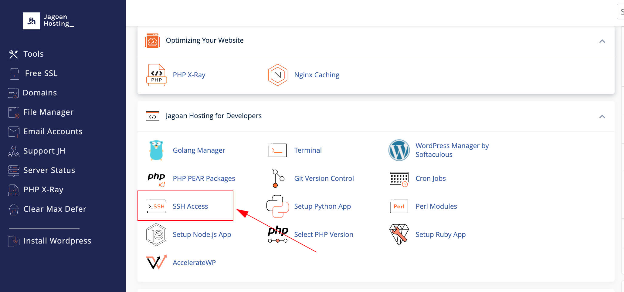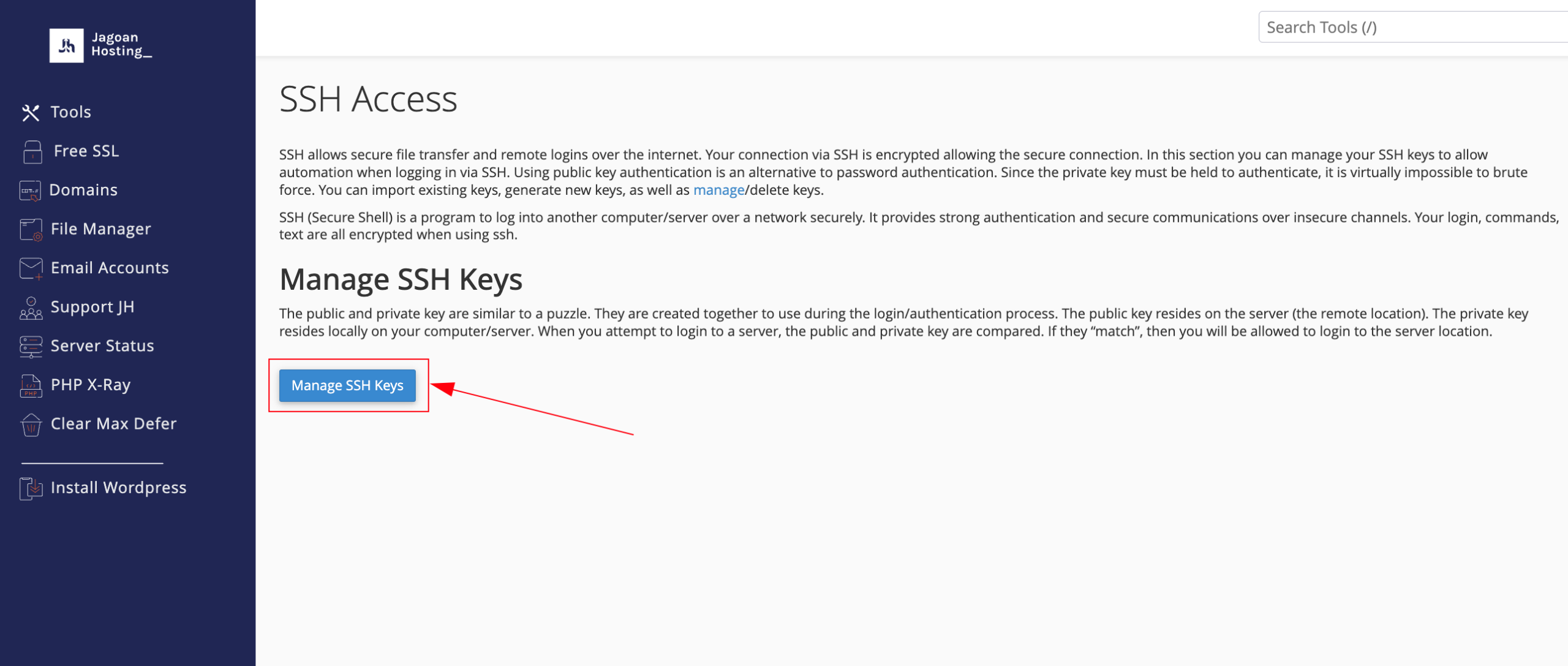 - Masuk ke menu SSH Access di cPanel, kemudian button Manage SSH Key