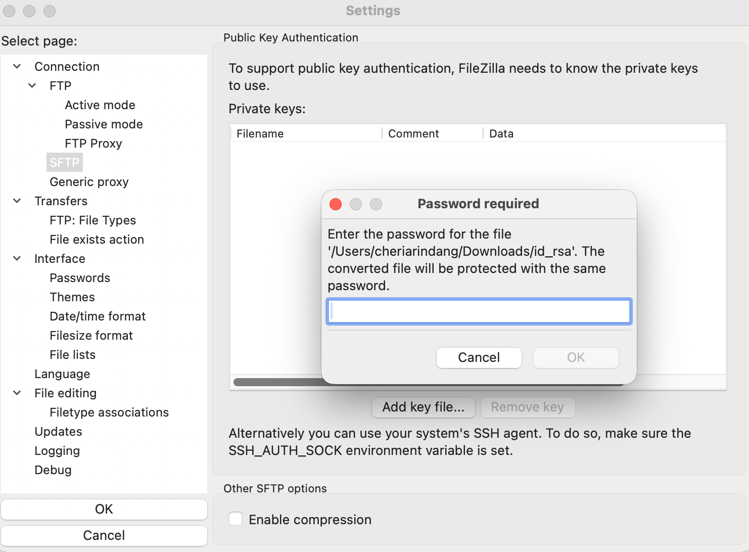 2. Setelah itu bisa klik button Add Key file, kemudian masukkan file Private Key yang sudah di download sebelumnya, dan akan muncul pop up untuk mengisikan password