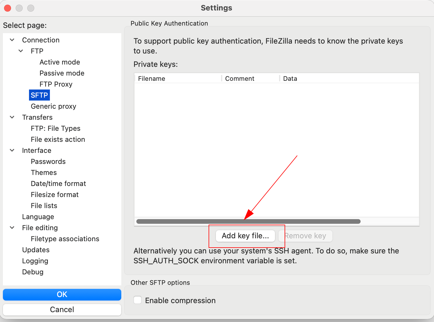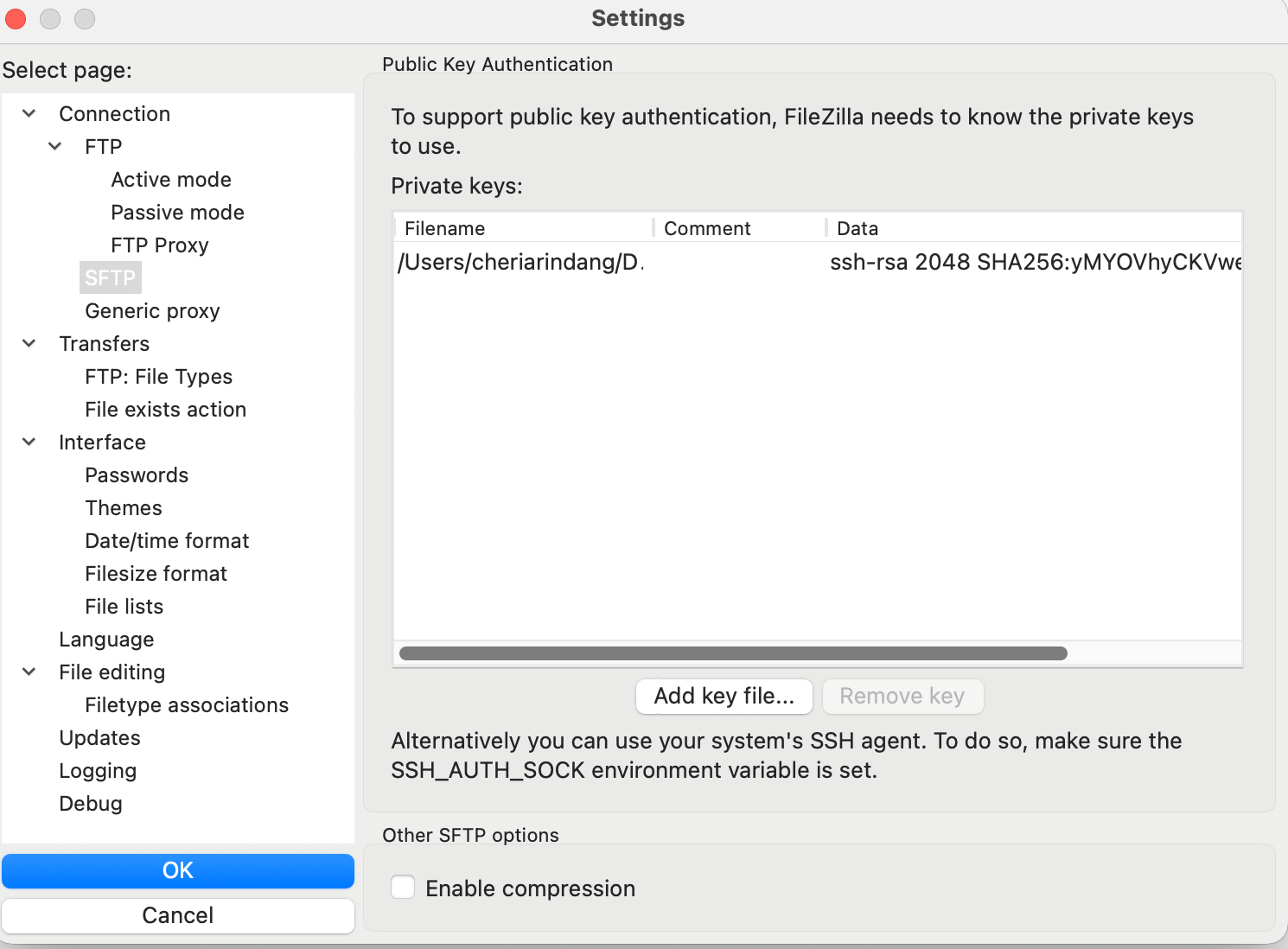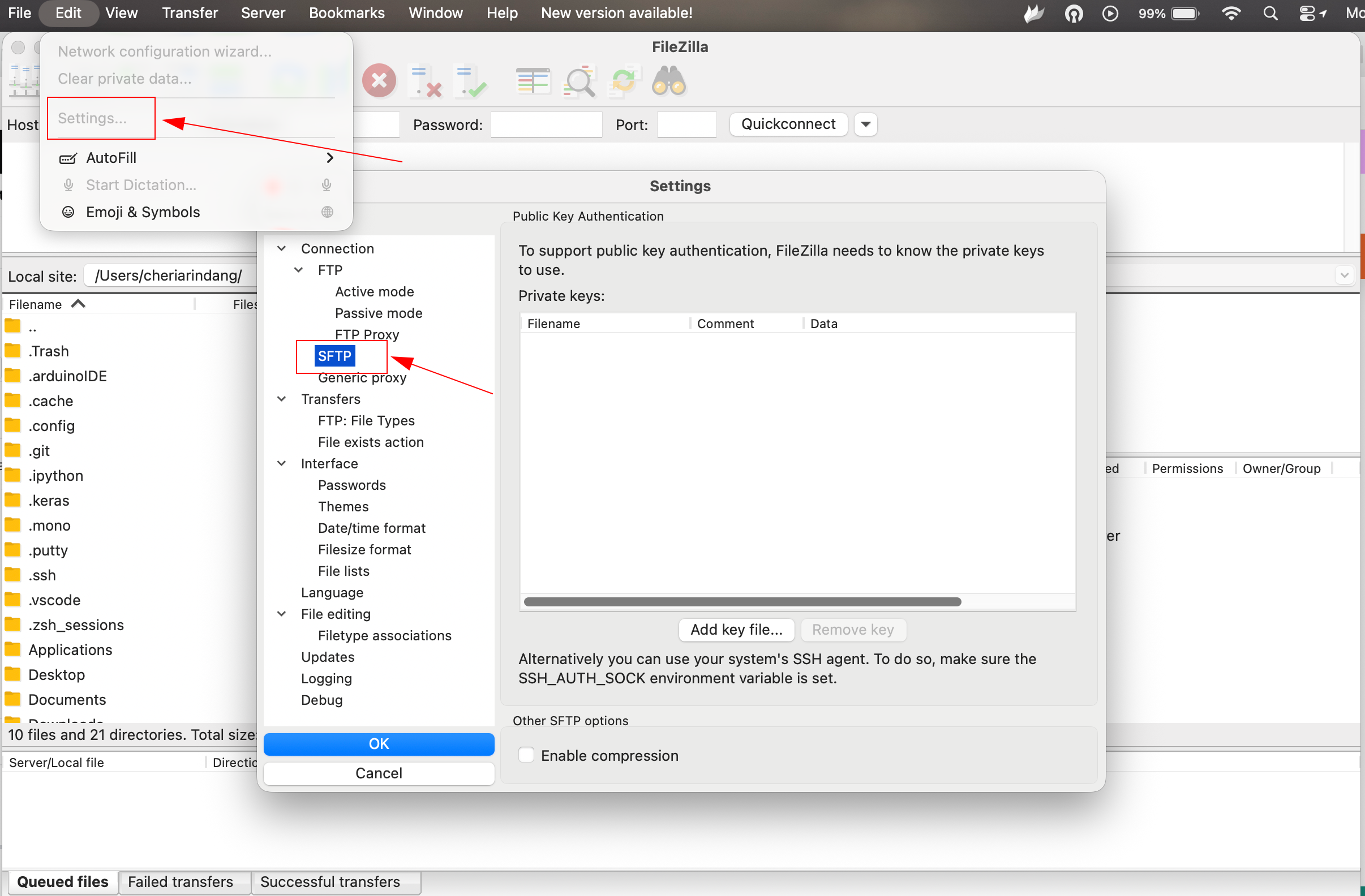 1.Buka aplikasi FileZilla, kemudian klik Edit > Settings > SFTP.
