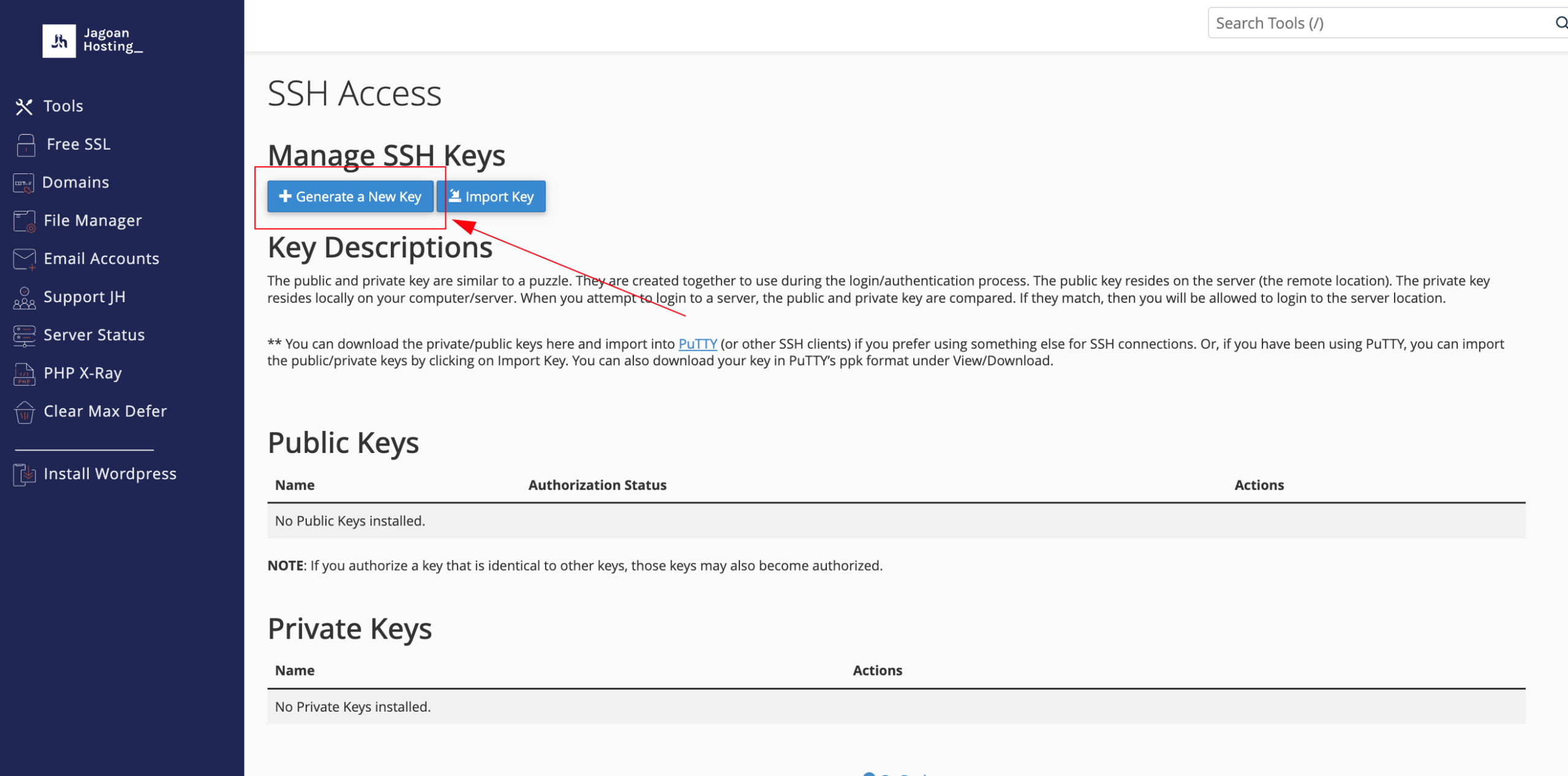 2. Jika belum memiliki Key, maka bisa dilakukan generate dengan klik button Generate a New Key