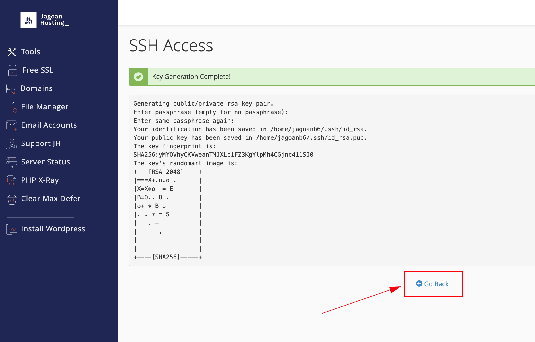 4. Jika key sudah berhasil dibuat, maka klik button Go Back