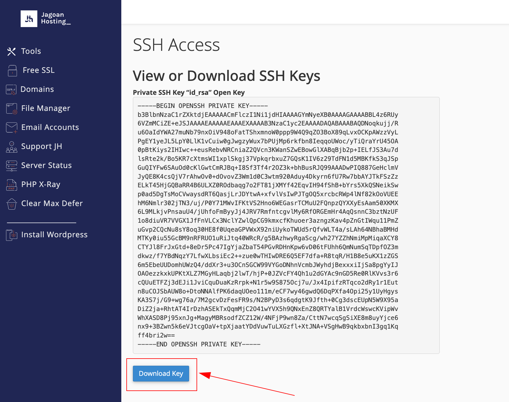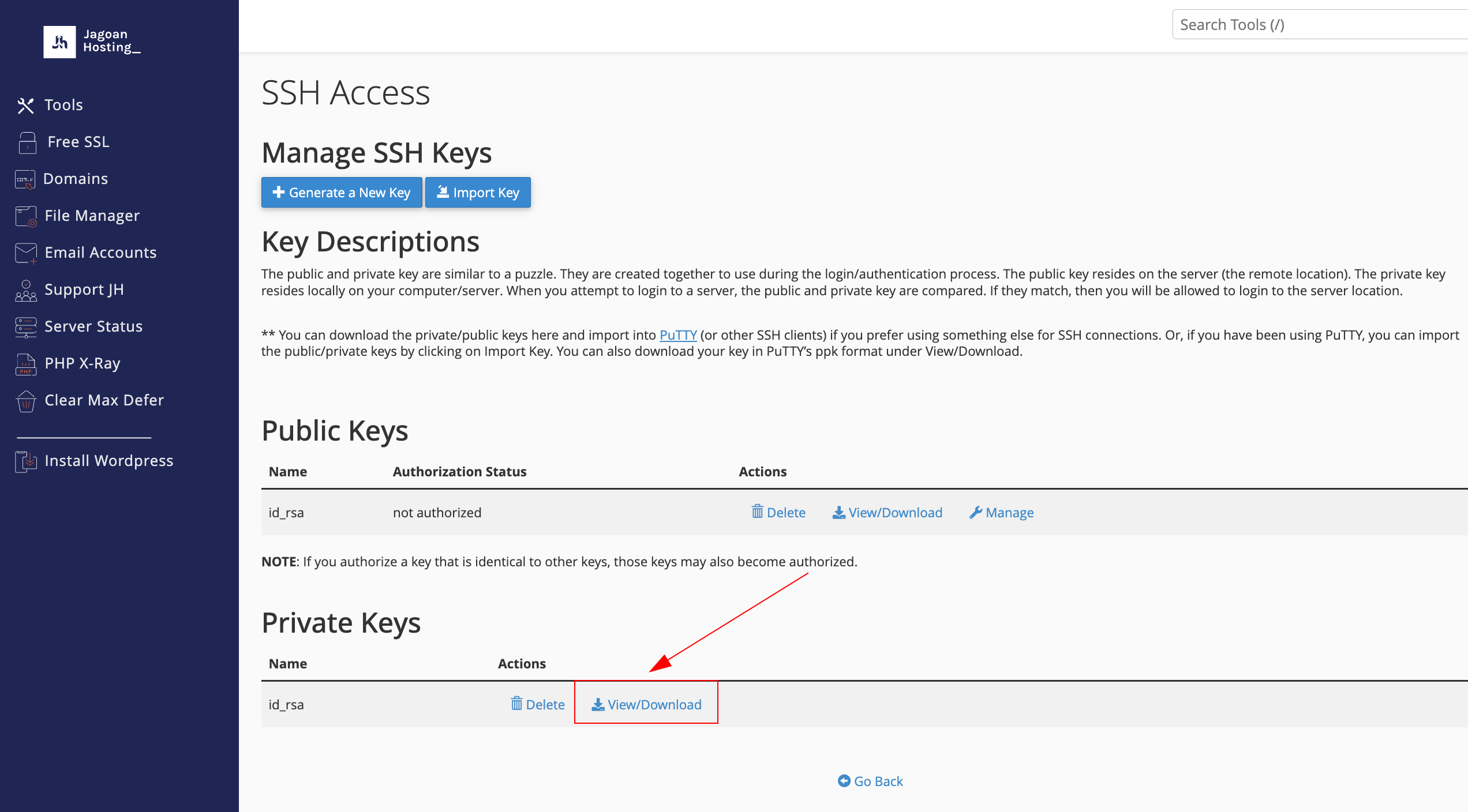 5. Kemudian download dengan cara ke menu SSH Keys dan klik View/Download pada Private Key.