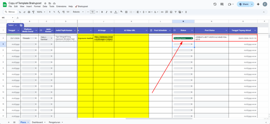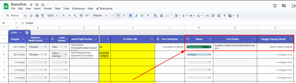 5. Jika berhasil maka nantinya untuk status akan berubah menjadi Posting Done, bagian post status akan terisi ID, dan untuk jam tayang aktual akan sesuai dengan kapan proses post to sosmed terisis sesuai dengan kapan kamu menjalankan menu tersebut.