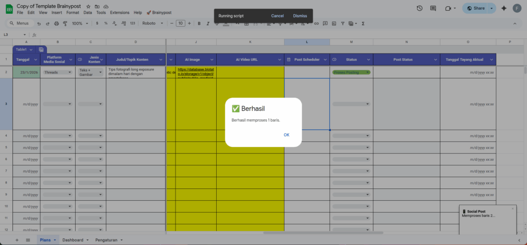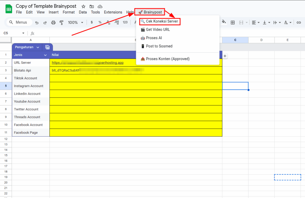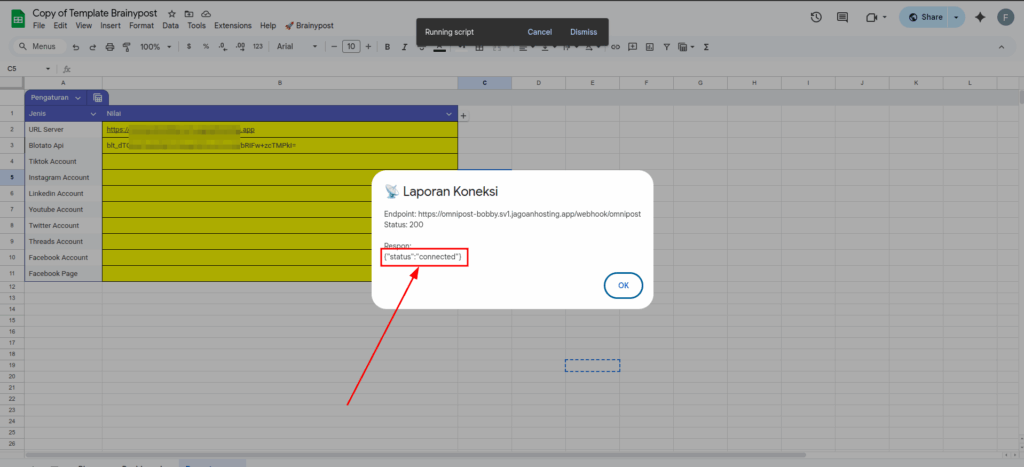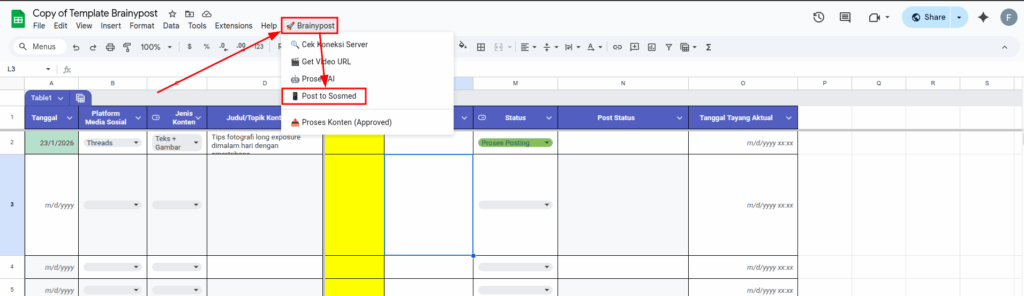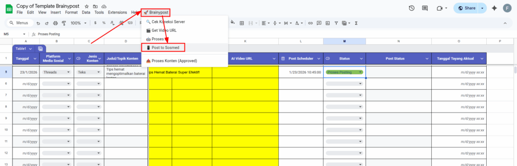 8. Selanjutnya ujicoba koneksi antara google sheet dengan blotato dengan cara klik menu BrainyPost dan pilih Cek Koneksi