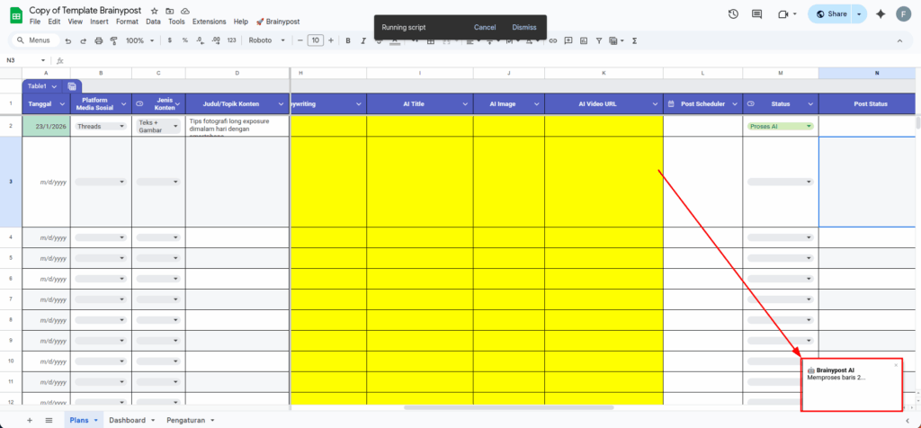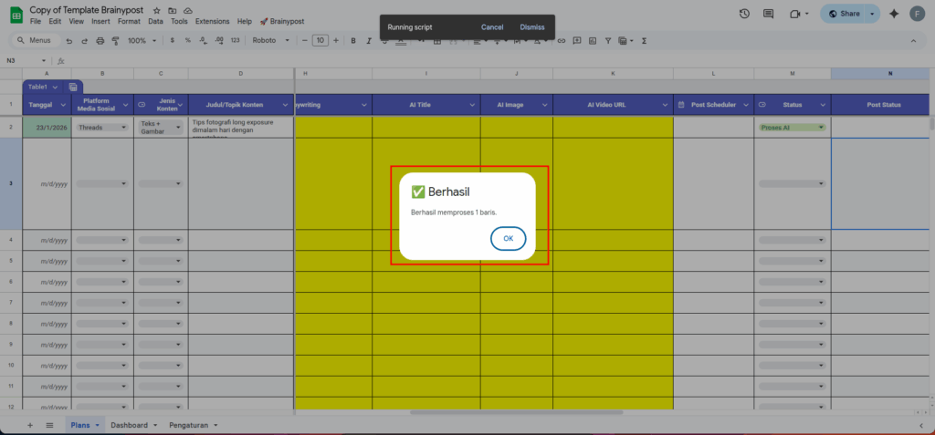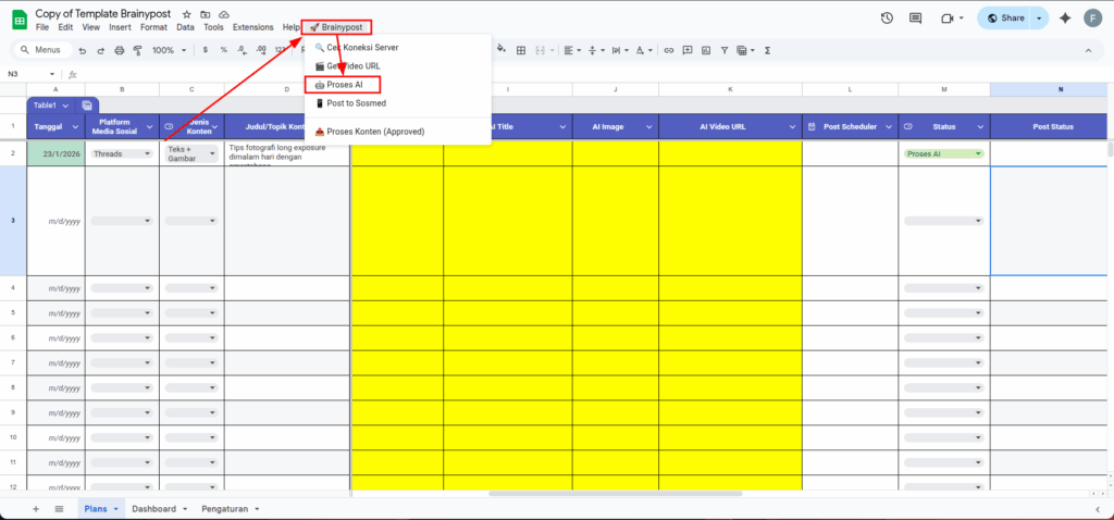 10. Terakhir klik menu BrainyPost dan pilih proses AI agar AI bekerja membuat konten sesuai yang kita intruksikan tadi