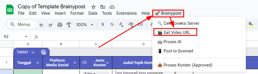 Untuk pembuatan video pendek AI memerlukan waktu yang lebih lama. Dan jika URL video dengan format https://xxxx belum muncul (masih muncul ID dan angka) tunggu beberapa saat kemudian klik menu BrainyPost dan pilih Get URL Video