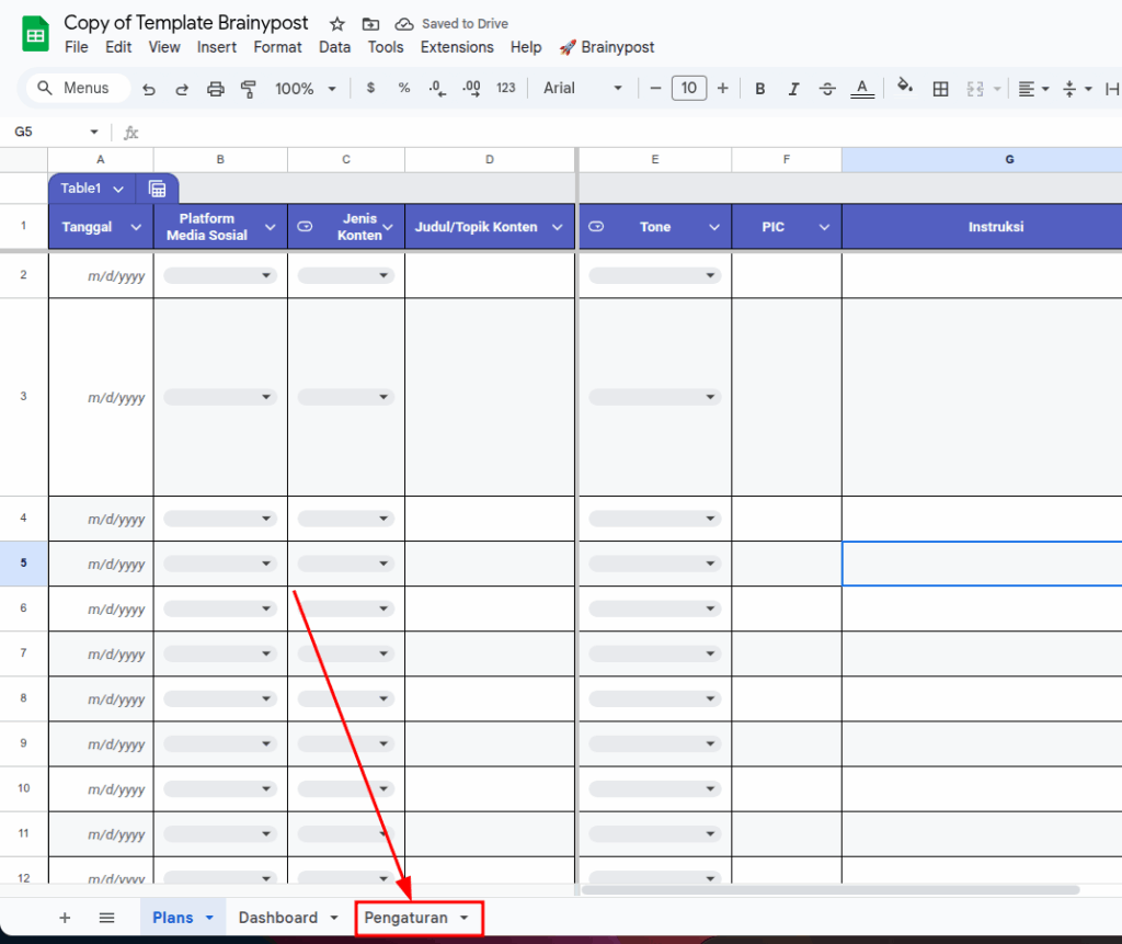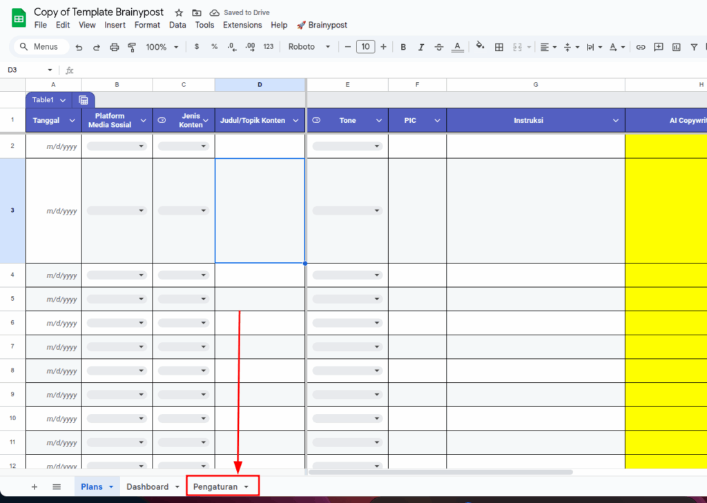 5. Jika sudah buka template google sheet yang sudah kamu duplikat tadi dan klik tab pengaturan