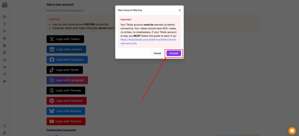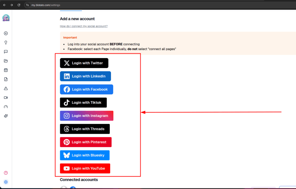 Sebelum menghubungkan sosial media ke blotato, pastikan akun sosial media mu sudah login di browser yang sama.