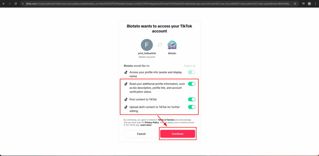5. Selanjutnya agar blotato nantinya dapat membuat post secara otomatis, berikan hak akses seperti gambar dibawah ini dan jika sudah klik continue