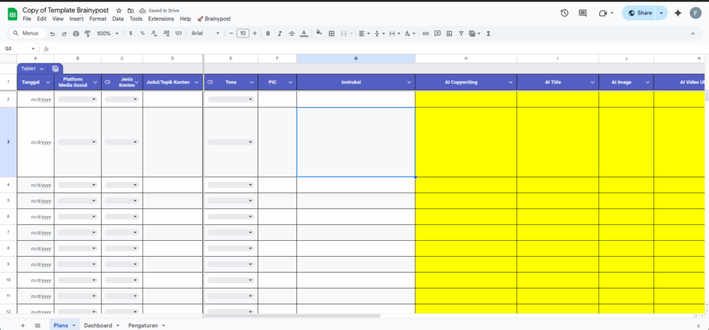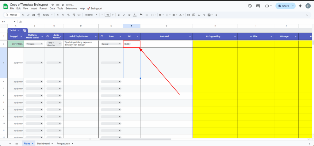 - Kolom PIC (Wajib di Isi) : Untuk memonitoring apabila google sheet tersebut nantinya digunakan oleh tim bukan hanya personal
