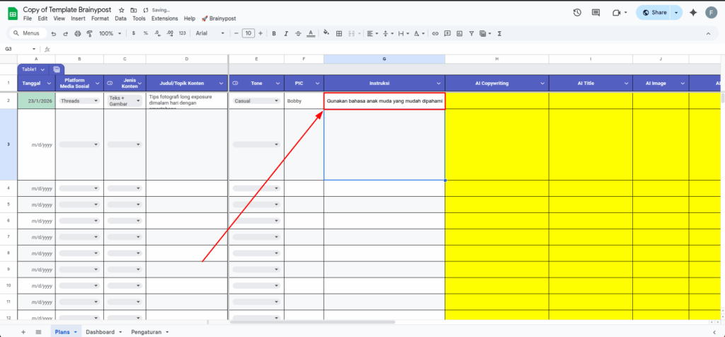 - Kolom AI Copywriting (Terisi Otomatis) : Hasil copywriting yang sudah dibuat AI