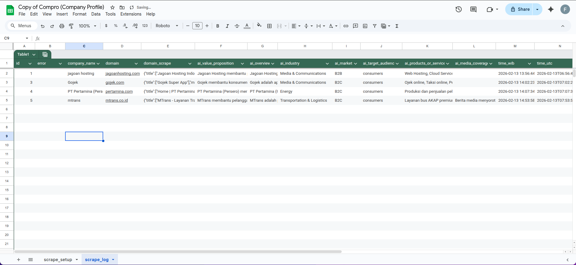 3. Jika sudah selesai buka sheet scarep_log dan informasi dari perusahaan yang kamu cari akan otomatis tampil pada kolom yang tersedia