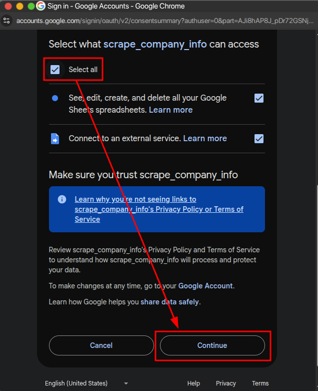 6. Klik select all untuk memberikan seluruh hak akses yang diperlukan dan selanjutnya klik button continue