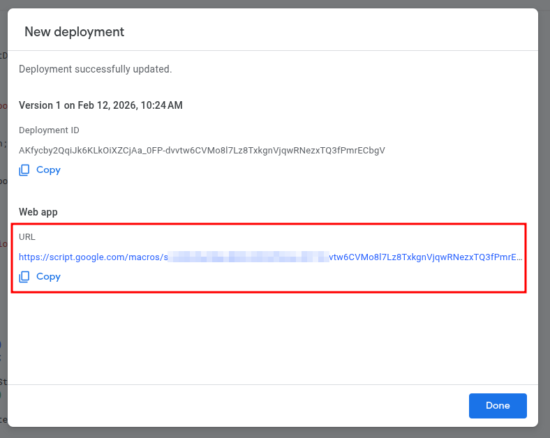 7. Jika sudah kamu akan mendapatkan deployment ID dan URL Web app. Copy URL Web App