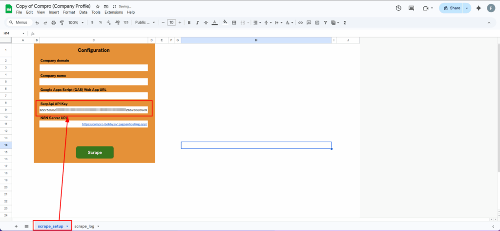 3. Kemudian buka template google sheet yang sudah kamu duplikat tadi. Klik tab scrape_setup dan masukkan API key dari serpapi kedalam kolom SerpAPI API Key seperti gambar dibawah ini
