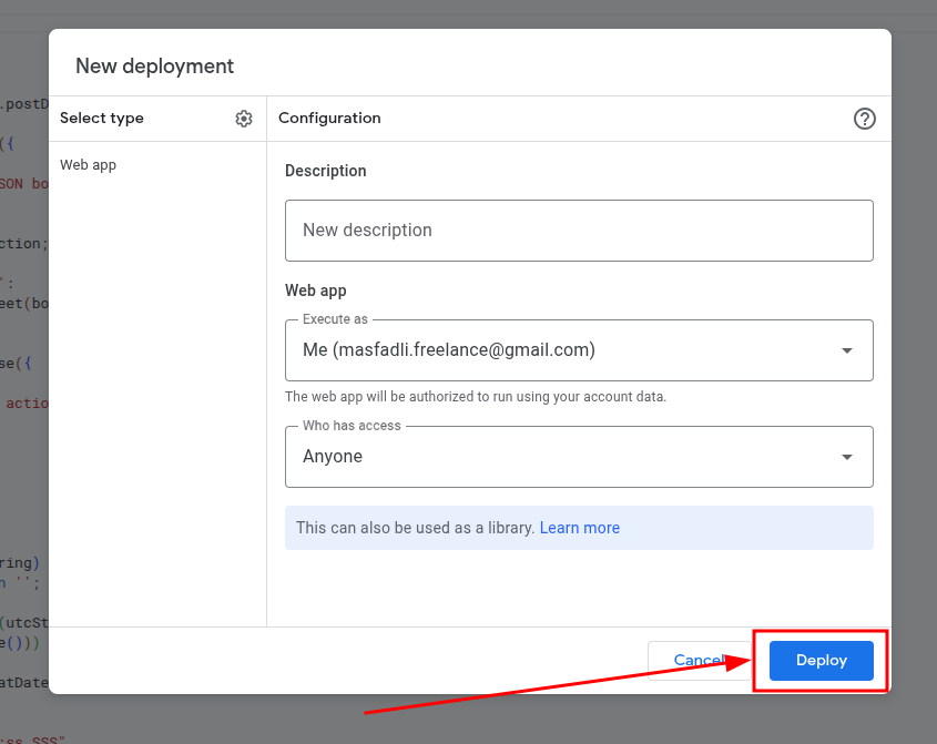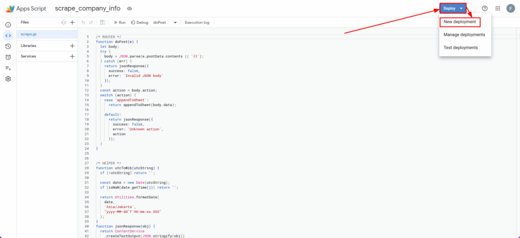 2. Kemudian klik menu deploy dan pilih new deploy pada script yang sudah ada.