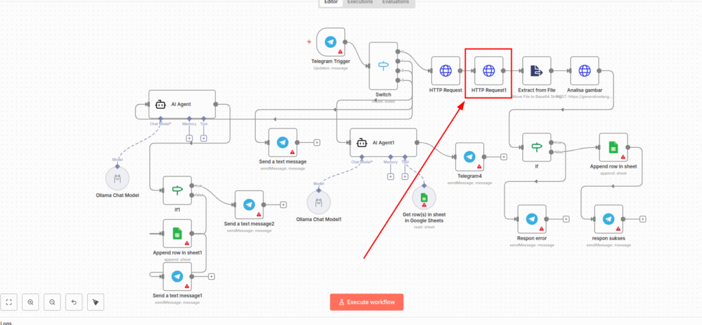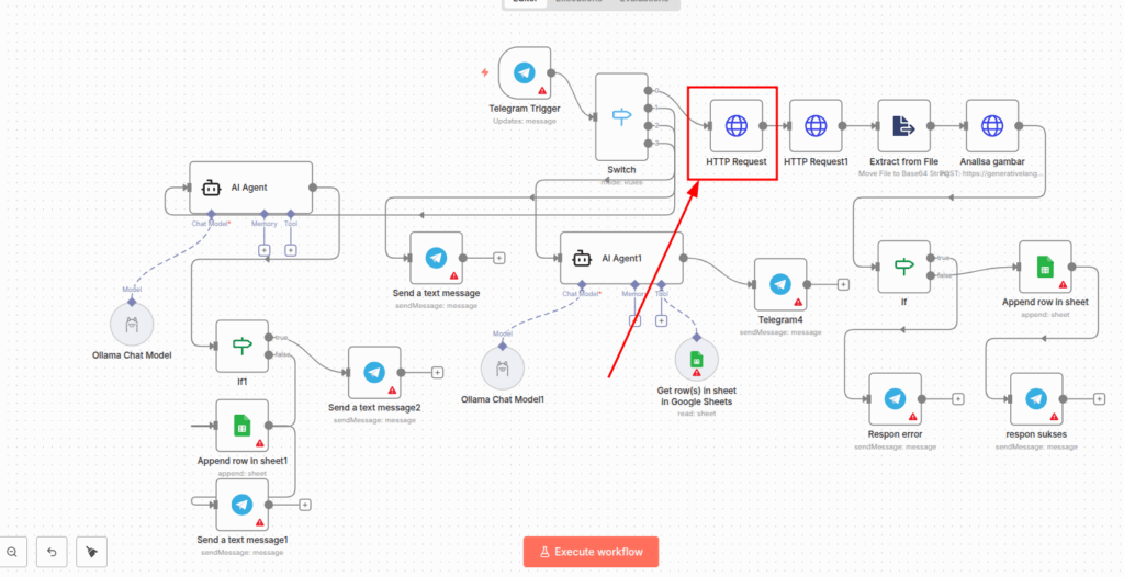 Pada workflow StrukPintar, terdapat 2 node HTTP Request yang berfungsi untuk berkomunikasi dengan Telegram API.