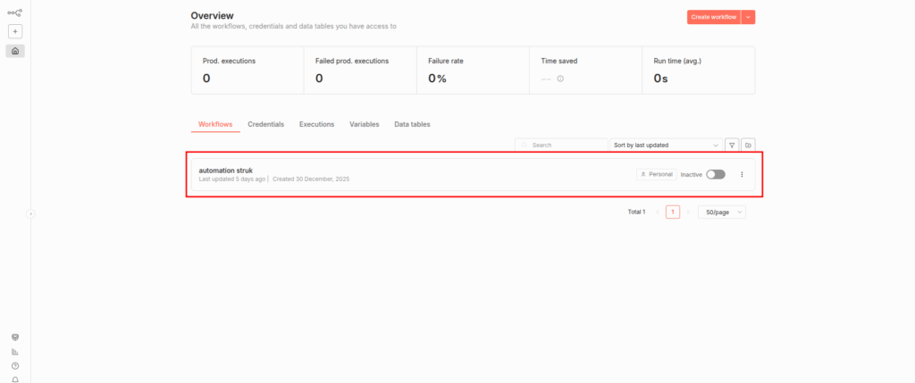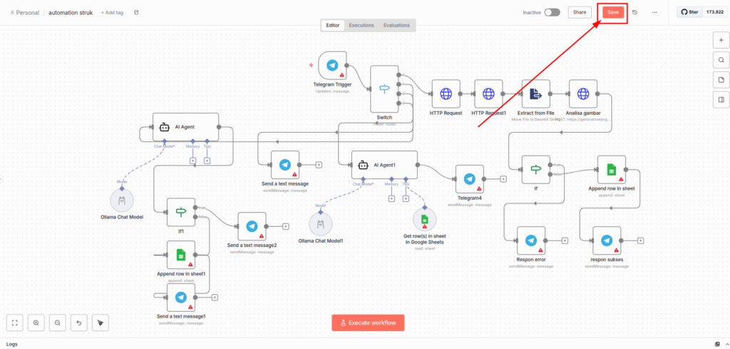 2. Masuk ke workflow StrukPintar yang ada didalam n8nmu
