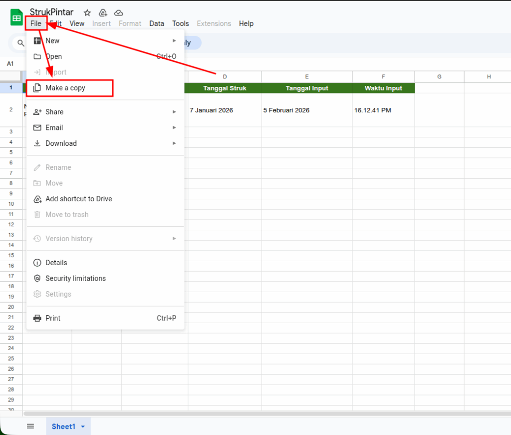 Langkah Kedua : Membuat Salinan Template Spreadsheet